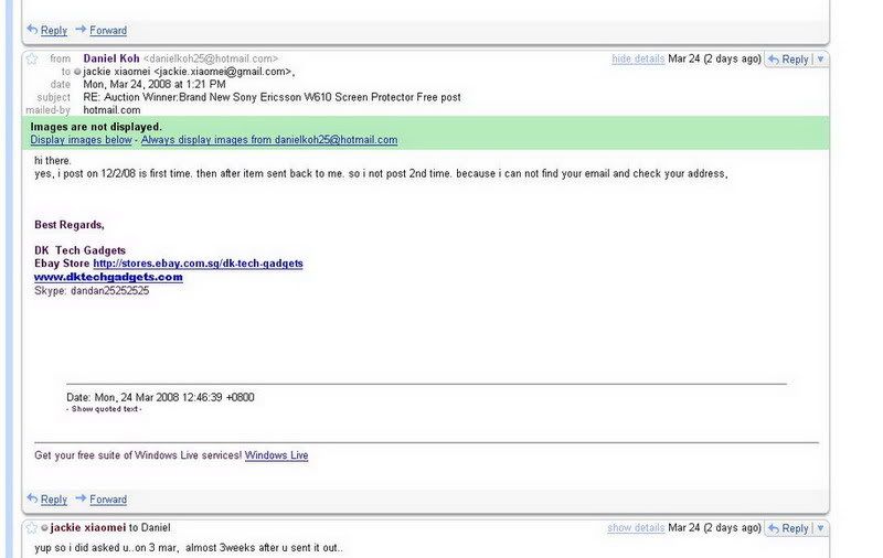 dateMon, Mar 24, 2008 at 1:21 PMsubjectRE: Auction Winner:Brand New Sony Ericsson W610 Screen Protector Free postmailed-byhotmail.com